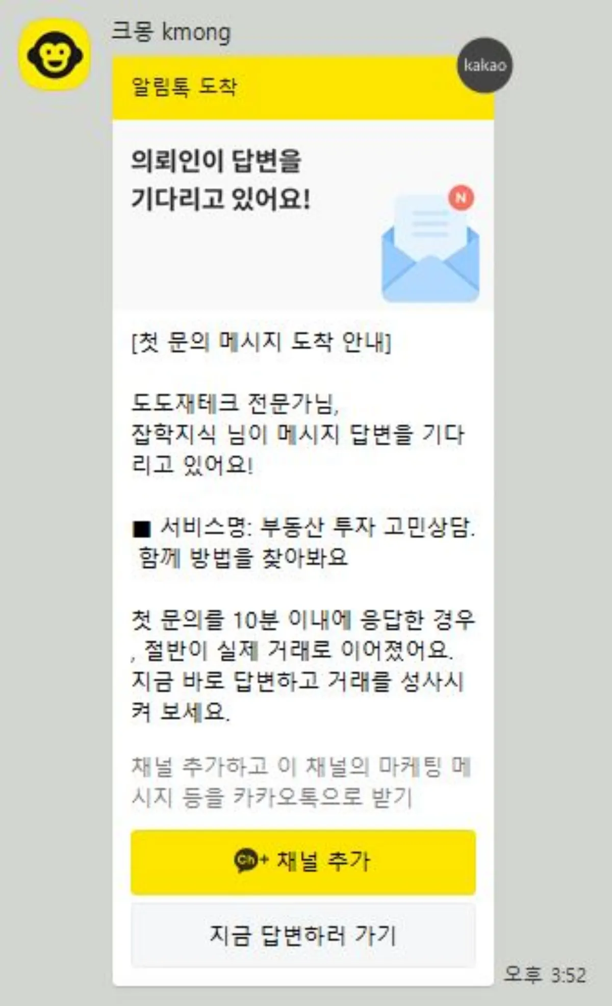 카톡으로도 알림이 같이 뜨기 때문에, 크몽의 편리성에 대해서는 너무 좋더라고요.